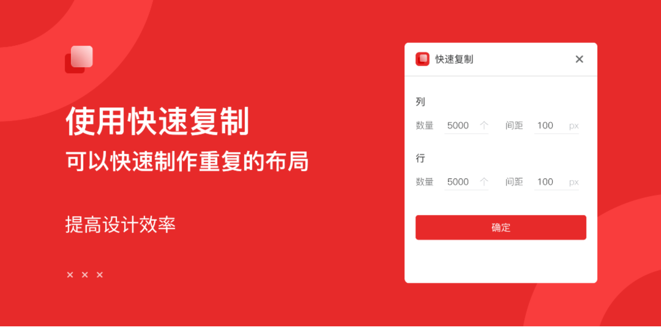 设置列/行的数量和间距,即可快速克隆所选图层,告别重复工作量的同时,还可以提高排版效率。 1. 选中图层或编组,打开插件; 2. 设置列/行的数量和间距,点击“确定”即可。