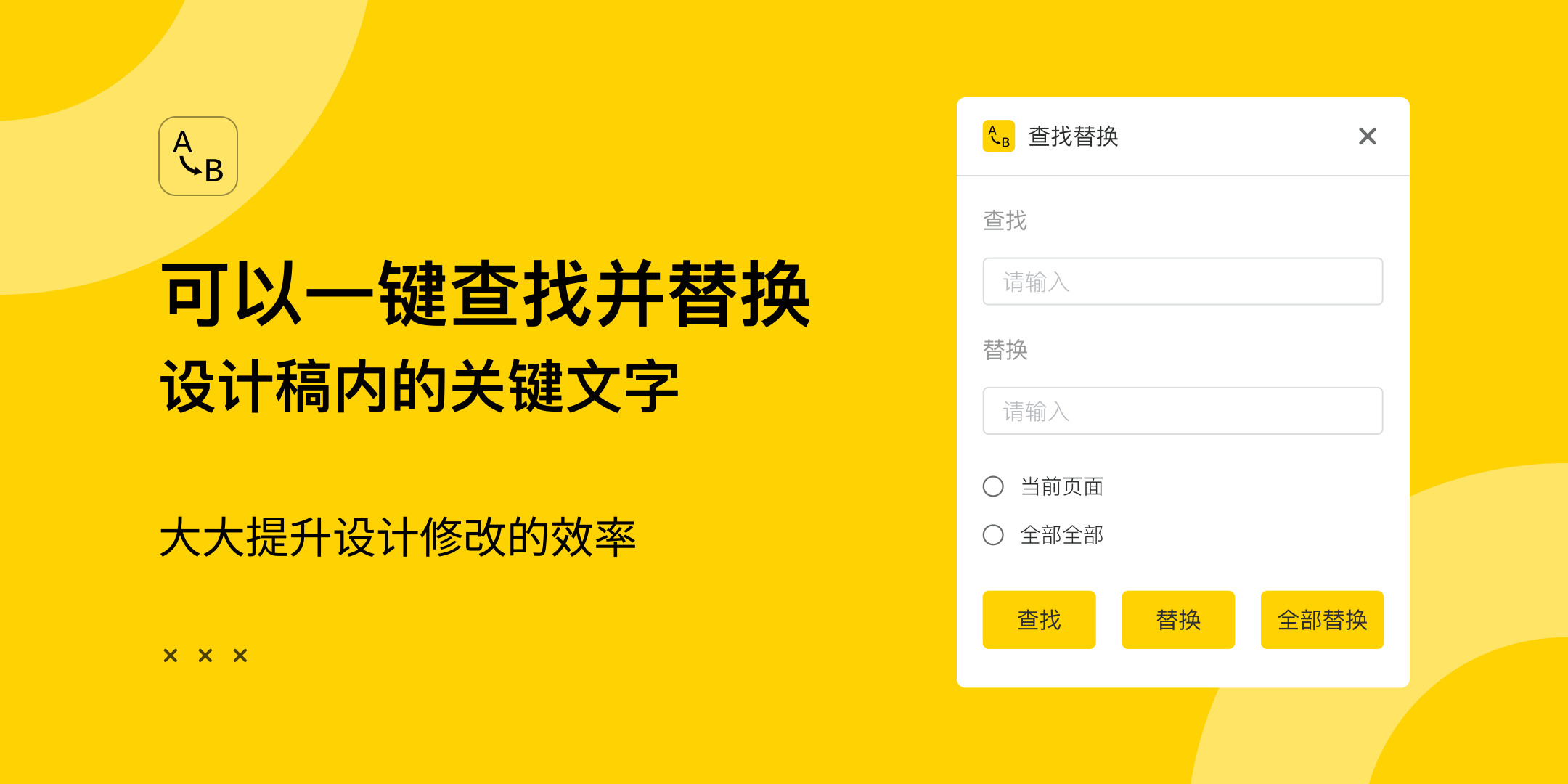 定位当前页面/全部页面的文本内容,并替换为新的文本内容,替换过程中不影响原有文本的属性。 1. 打开插件,在查找输入框内输入文本内容; 2. 在替换输入框内输入新的文本内容; 3. 选择当前页面或全部页面,点击“确定”即可。