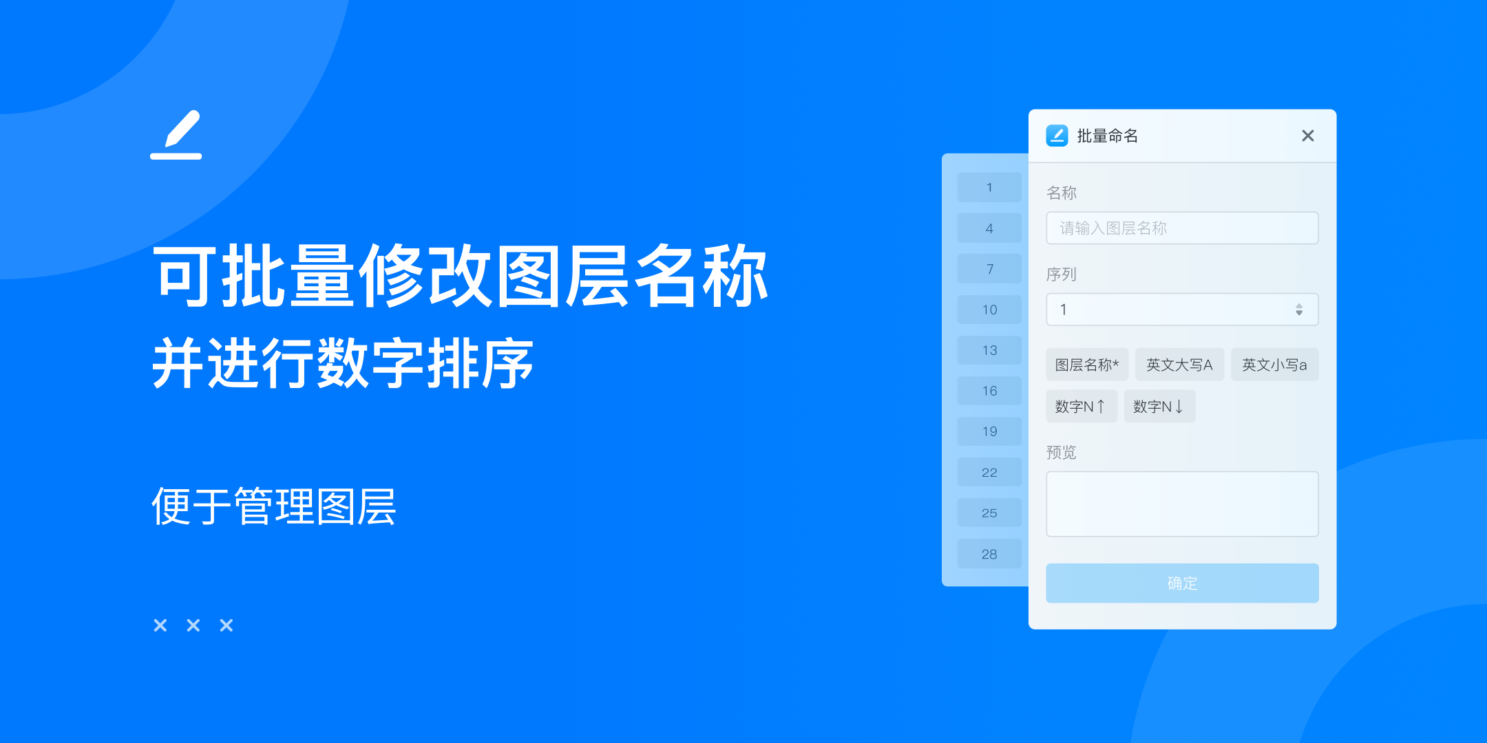 支持对所选图层名称批量修改,无需逐一手动命名,快速整理设计稿内的图层。 1. 选中图层,打开插件; 2. 选择图层名称、英文大小写及数字升降序等组合方式重命名; 3. 命名后的效果可实时预览。