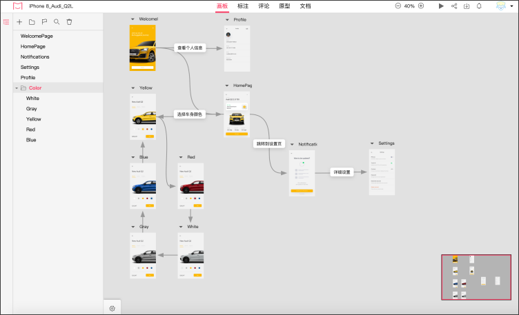 Audi原型提供了十个设计页面,画板中可查看所有页面及页面间的逻辑关系: