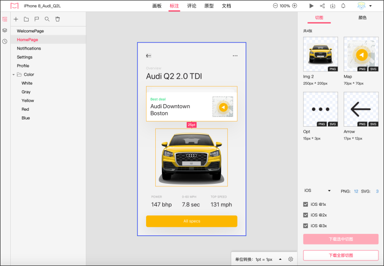 原型中鼠标滑过元素可以智能生成标注,同时支持一键下载切图: