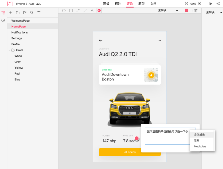 项目协作时成员添加的评论,所有成员都可查看与回复,同时支持@项目成员查看评论: