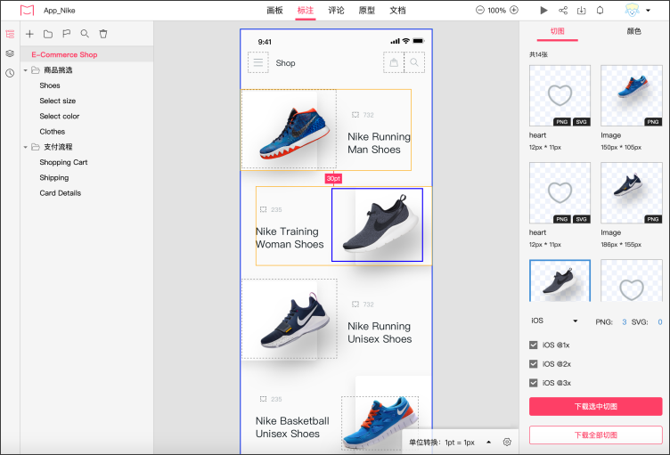 原型中鼠标滑过元素可以智能生成标注,同时支持一键下载切图: