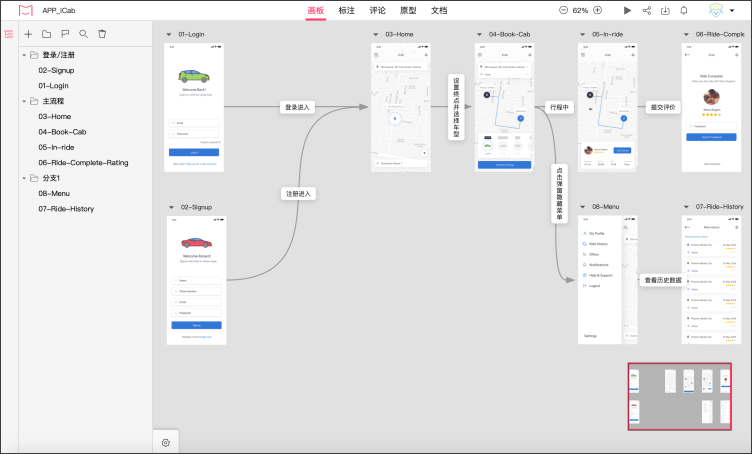 iCab原型提供了九个设计页面,画板中可查看所有页面及页面间的逻辑关系: