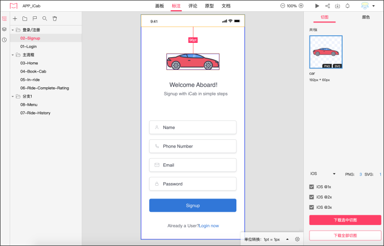 原型中鼠标滑过元素可以智能生成标注,同时支持一键下载切图: