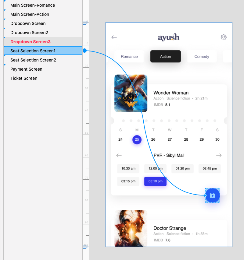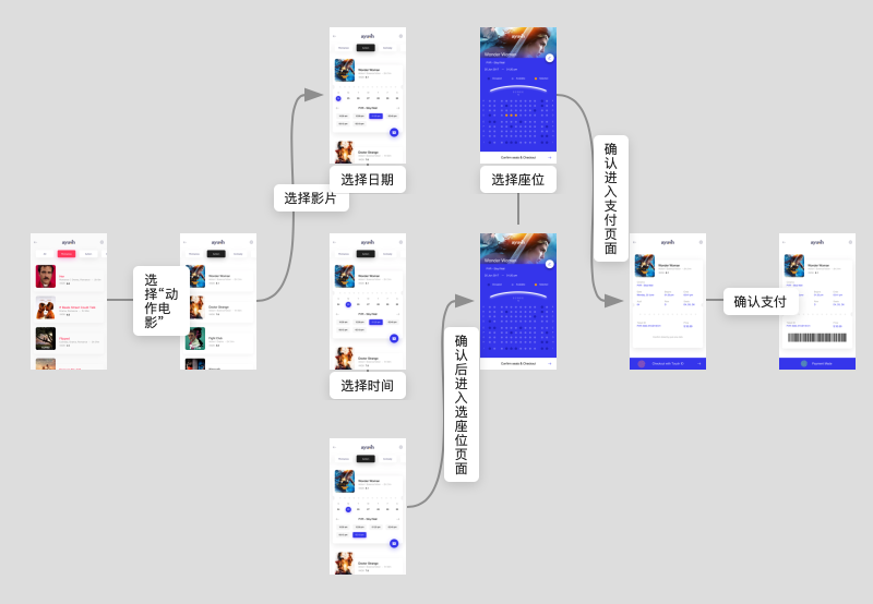 Movie Booking原型提供了9个设计页面,画板中可查看所有页面及页面间的逻辑关系;