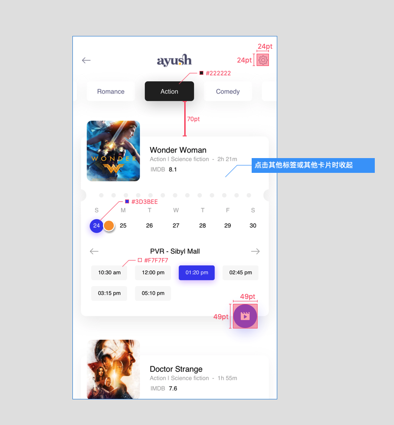 Movie Booking是一款简单好用的在线购电影票APP,提供最新最快的购票资讯,简洁的层级和简单的逻辑,帮助用户快速完成购票操作。例子中将展示使用Movie Booking的购票操作流程。我们可以使用摹客中最常用的8种交互方式以及15种交互动画,展示基本的页面跳转,以及滑动确认的效果。