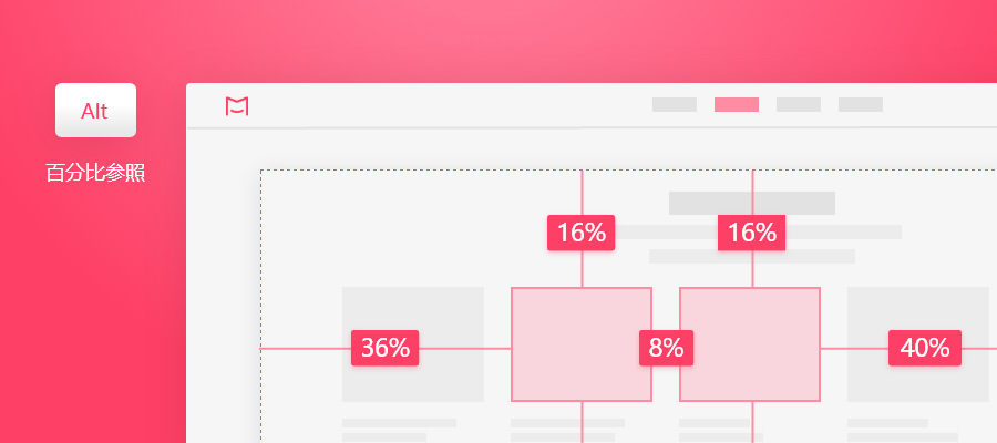按Alt可显示百分比标注,不需要提前设置参照,系统会自动选取相邻的父级图层作为百分比参考。