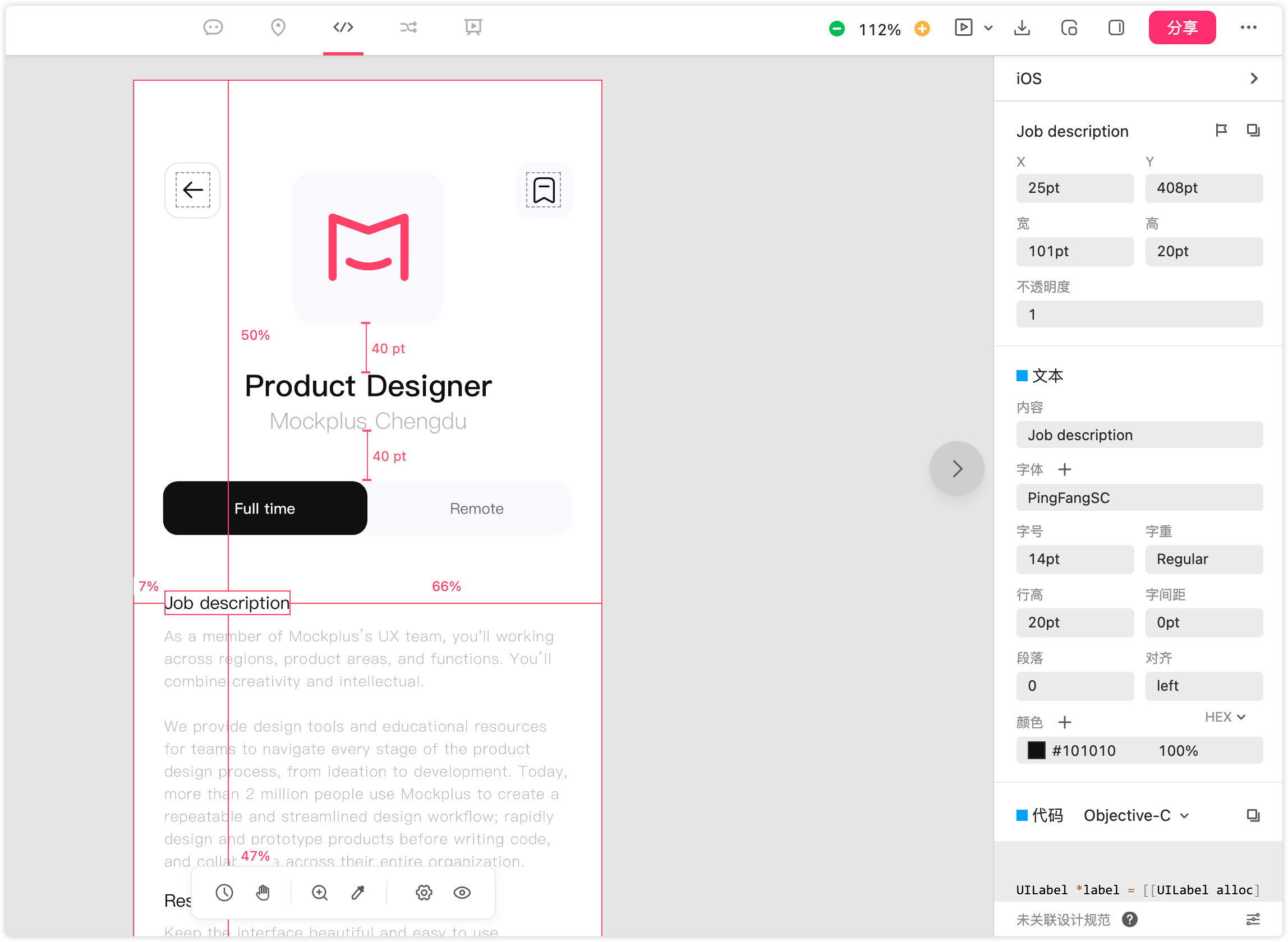 - 开发模式:主要角色是开发工程师,可在开发模式中,查看智能标注,根据开发需要选取标注信息,同时,还可以在摹客下载多种设备尺寸的切图。这还可以大大节省设计师的工作量以及与开发间的沟通成本。
