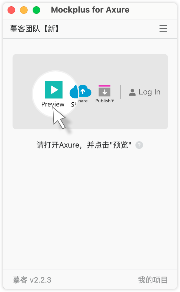 登录后,会弹出一个“请打开Axure,并点击预览”的提示界面。回到Axure,在右上方点击“预览”图标,浏览器会打开一个原型演示页面。