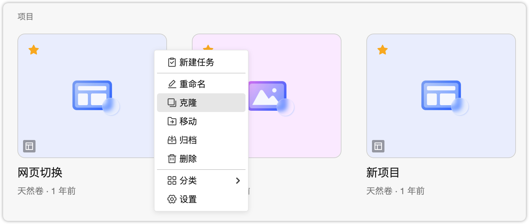 点击项目上的“更多”图标,选择“克隆”,即可克隆项目。