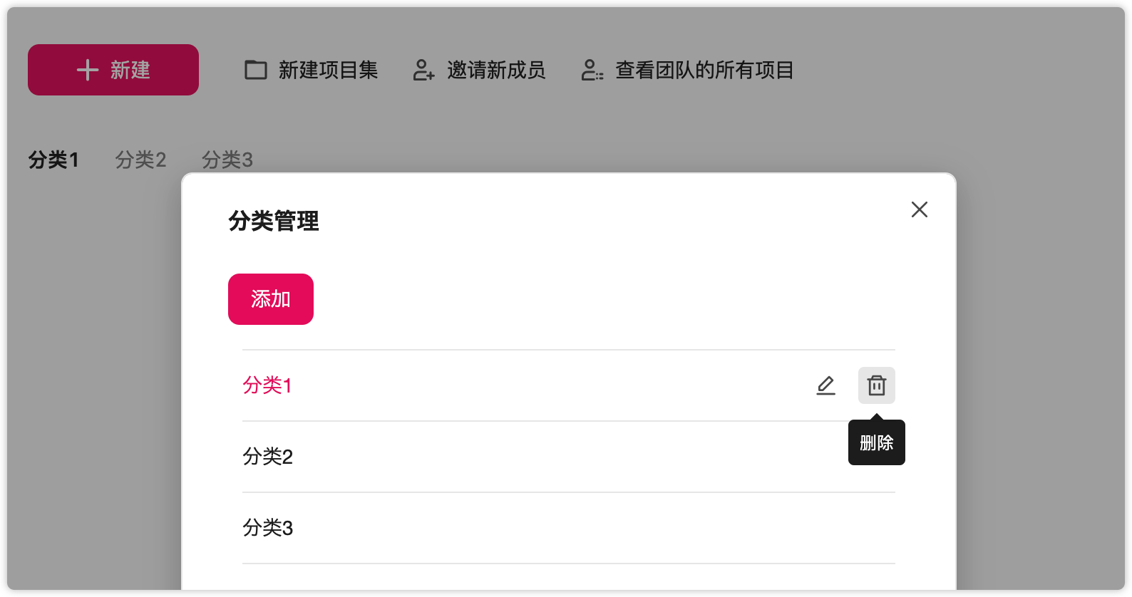 点击后,在弹窗上点击"添加",即新建分类。点击“删除”图标,即可删除分类。注意,删除分类并不会删除分类内的项目,这些项目将变为无分类状态。