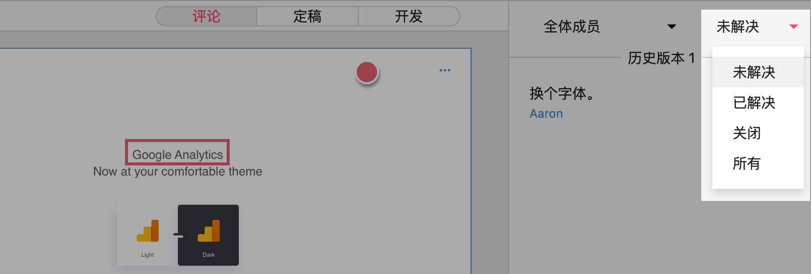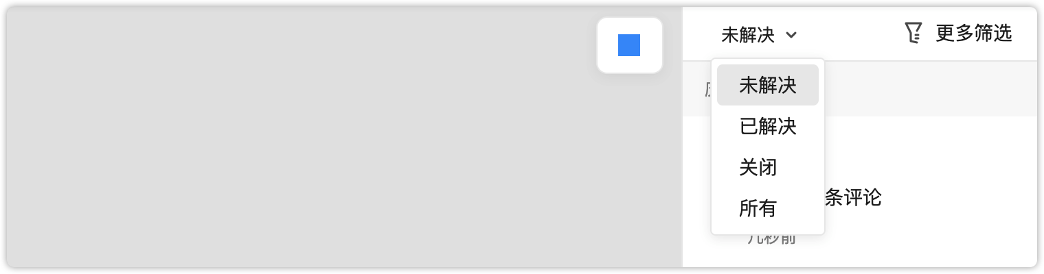 评论面板展示了所有历史评论。点击面板右上角下拉框,选择”未解决“、“已解决”、“关闭”、”所有“,对评论进行筛选。