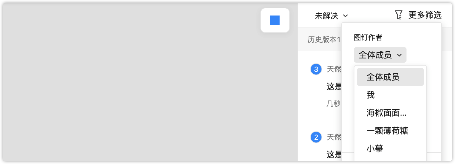 在团队协作时,如果多个成员添加了评论,可根据成员名筛选出某个成员的评论或者全体成员评论。