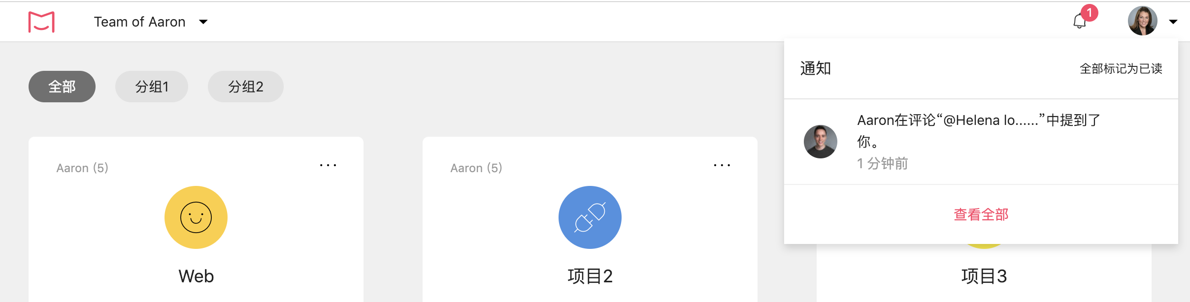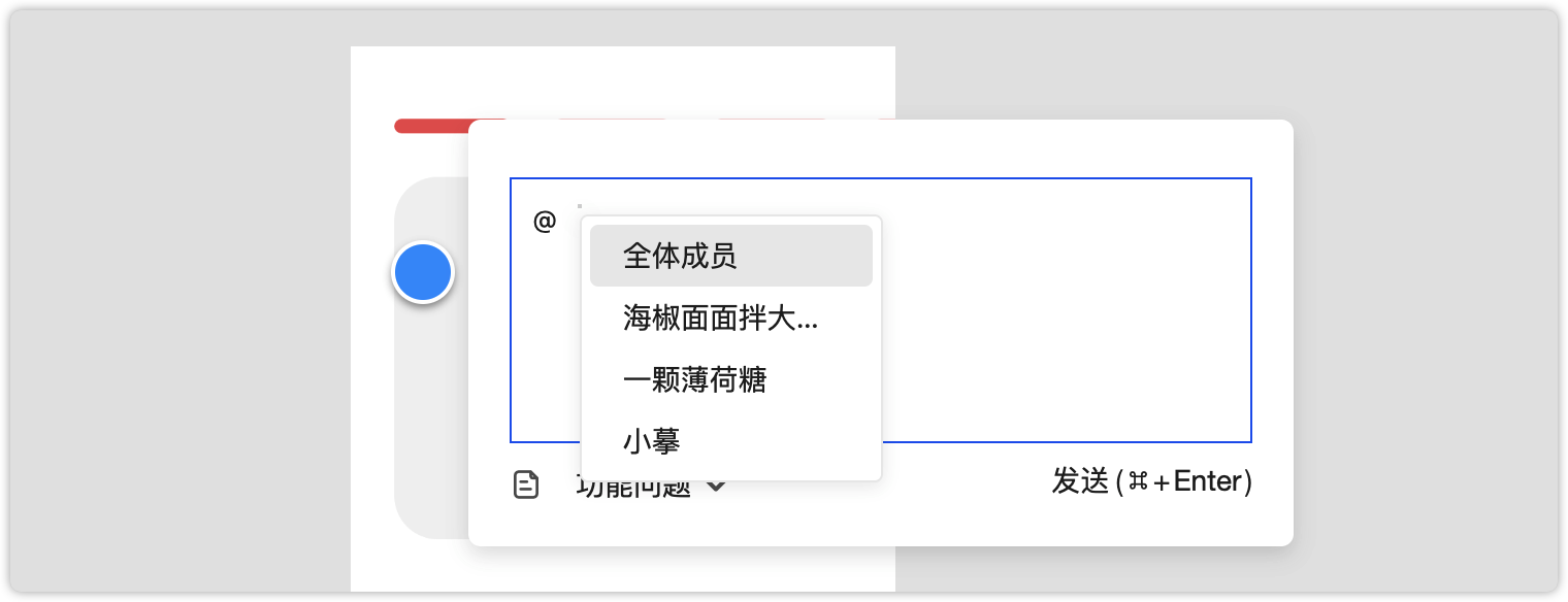 评论时,可@某个成员或者全体成员。输入“@”符号便会弹出@成员下拉框,通过鼠标选取即可@目标成员。