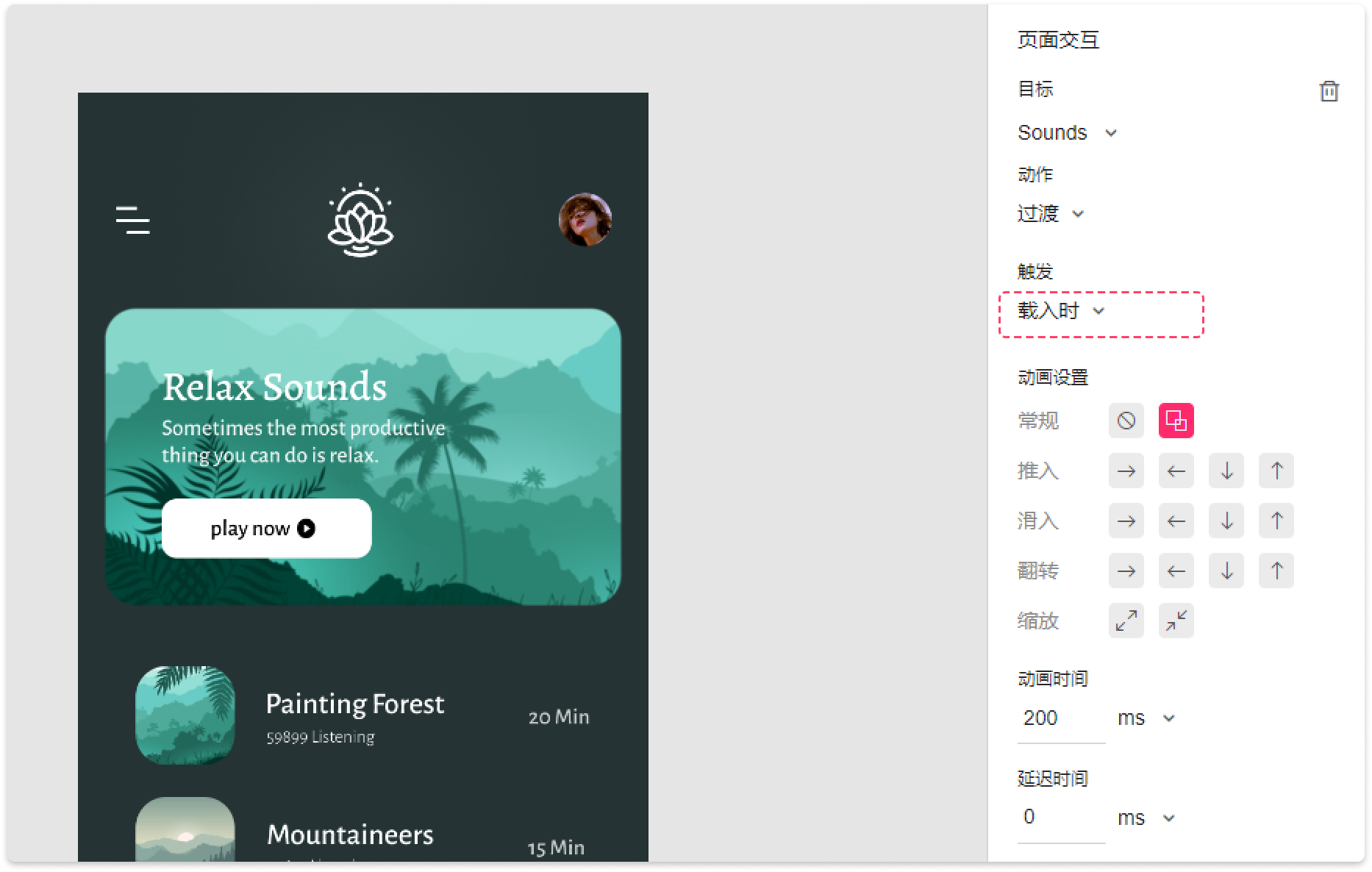 如需制作进入页面后自动执行的交互,需要在未选中热区的情况下,在右侧面板中手动选择对应的目标页面后,触发方式将默认为载入时。