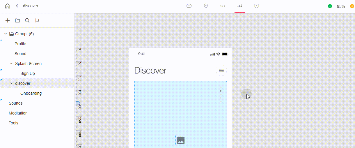 按住鼠标左键,在设计稿上绘制一个矩形的热区,再松开鼠标,在左侧项目树选择跳转的目标页面,即可完成交互跳转链接的设置。
