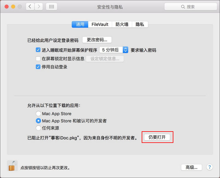 出现如上图所示的提示请打开“系统设置” > “安全与隐私” > “通用”,将“允许从以下位置下载的应用”选择为“任何来源”或选择“仍要打开”。