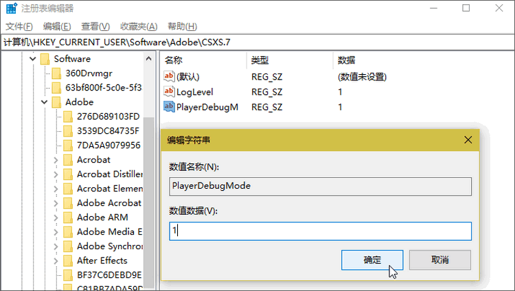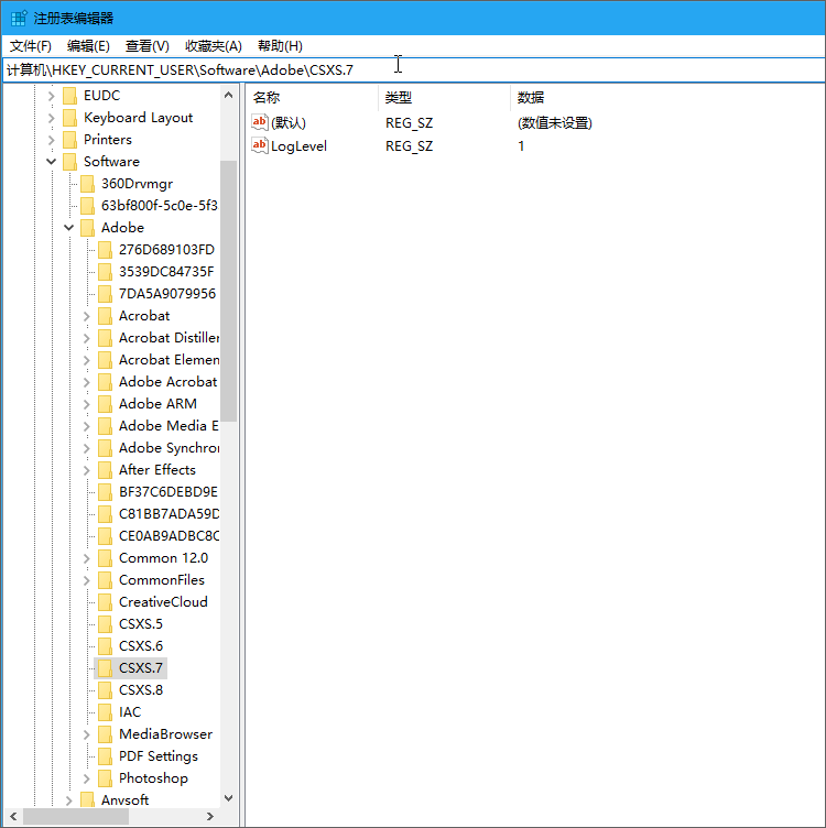 找到“HKEY_CURRENT_USER/Software/Adobe/CSXS.7”文件位置,可能会存在CSXS.5/6/7/8,请全部修改;
