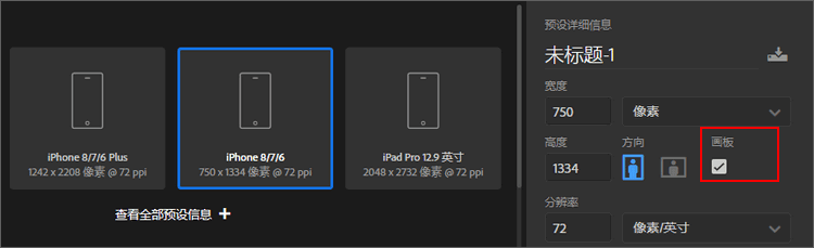 如发现没有画板可供选择,请在新建psd文件时勾选画板选项。