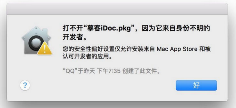 Mac安装时,显示“打不开 ‘摹客.pkg’ ,因为它来自身份不明的开发者。”