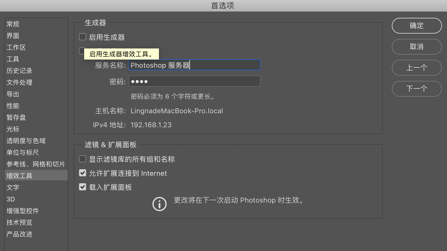 3. PS“首选项” > “增效工具”,将“载入扩展”的开关勾上;