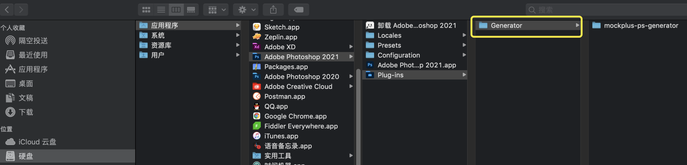 将mockplus-ps-generator的文件夹拖入下图的Generator中,拖入后,清除插件缓存后重启ps。