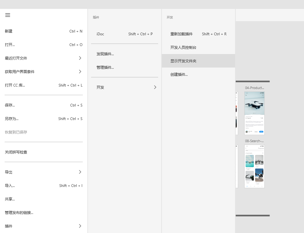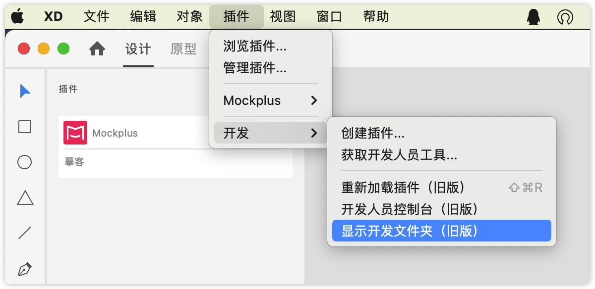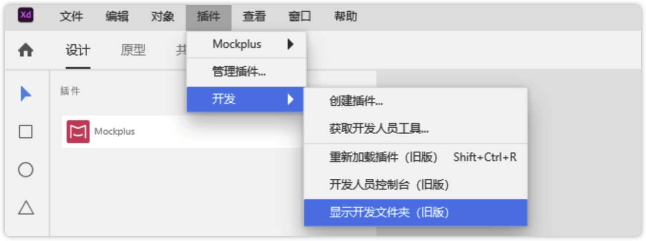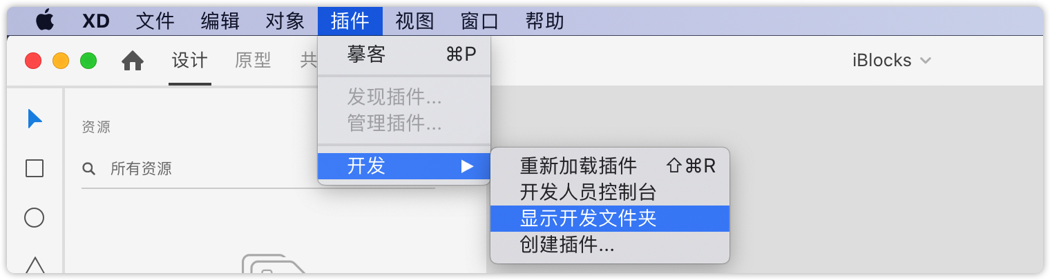 2. 在XD顶部菜单栏中找到“插件->开发->显示开发文件夹”。