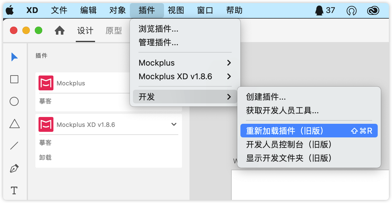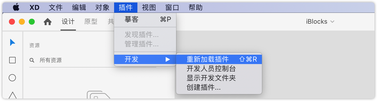 4. 在XD菜单中找到“插件”->“开发”->“重新加载插件”后,你的XD插件就可以正常使用啦!