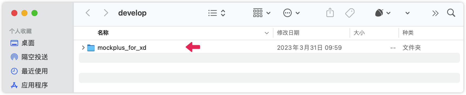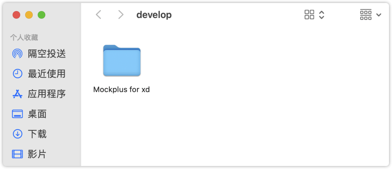 3. 显示开发文件夹后,会自动打开一个名为“develop”的文件夹,将第1步中的“Mockplus for xd”文件夹剪切并粘贴到“develop”文件夹中,最后重启XD即可。