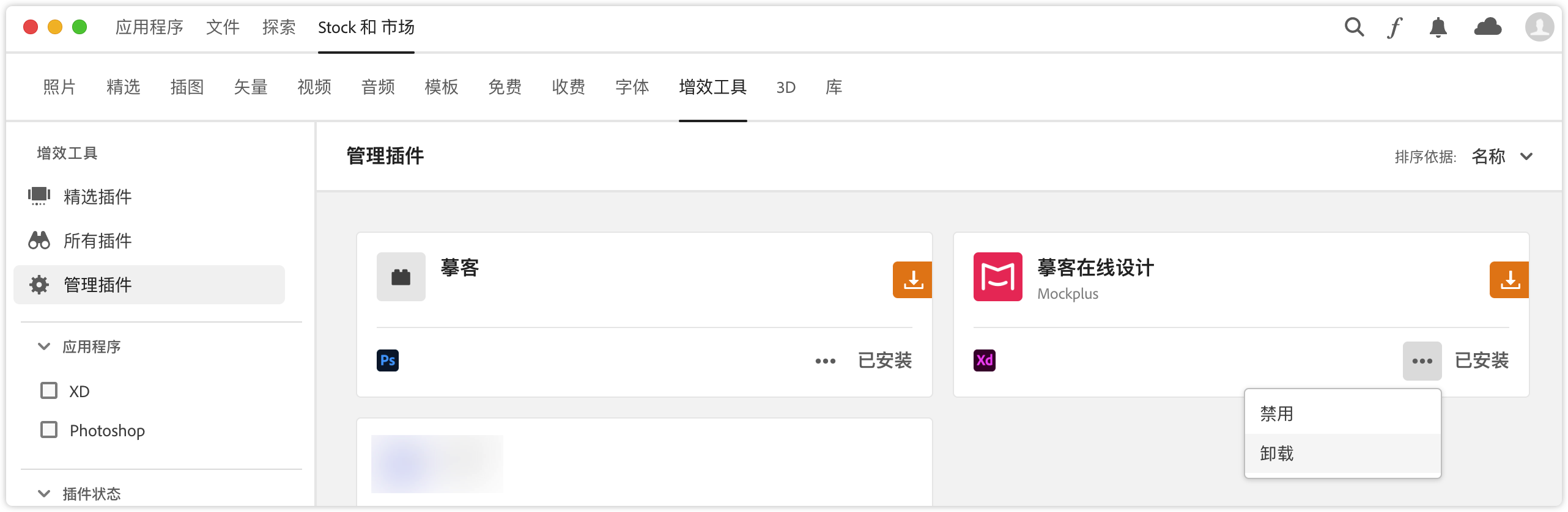 1. 若卸载 XD 正式版插件,可打开Creative Cloud 的增效工具页面,点击“更多->卸载”。