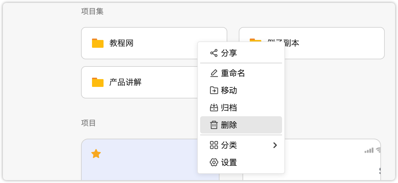 如果想删除项目集,请先将项目集内的项目全部移出,再做删除项目集的操作哦:在项目集封面右上角点击“更多”——“删除”。
