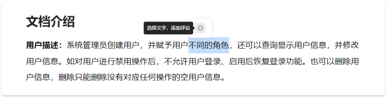 如果文档是在线创建的,可以标记文档中的内容,并添加评论。鼠标选中部分内容,然后点击“添加评论”的图标,即可高亮此处内容,添加评论,实时审阅。