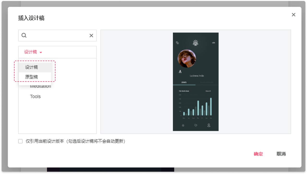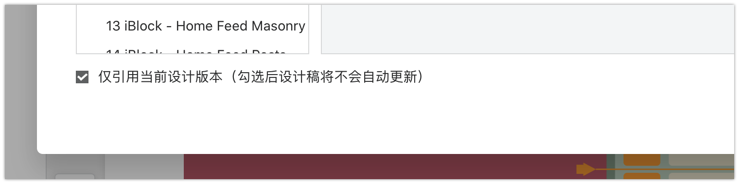 若不想同步更新,可在插入设计稿弹窗中勾选“仅引用当前设计版本”的选项,勾选后设计稿将不会同步更新。