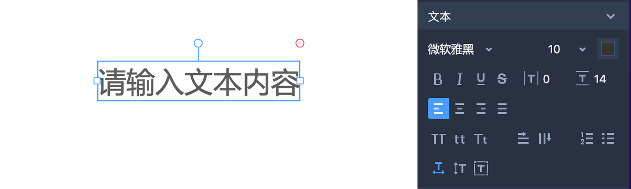 文本属性可以用来调整文本内容的格式,相关设置有字体、字号、字色、粗体、斜体、下划线、删除线、字间距、行高、对齐方式、大小写格式、首行缩进、竖排、编号、项目符号、自动宽度等。
