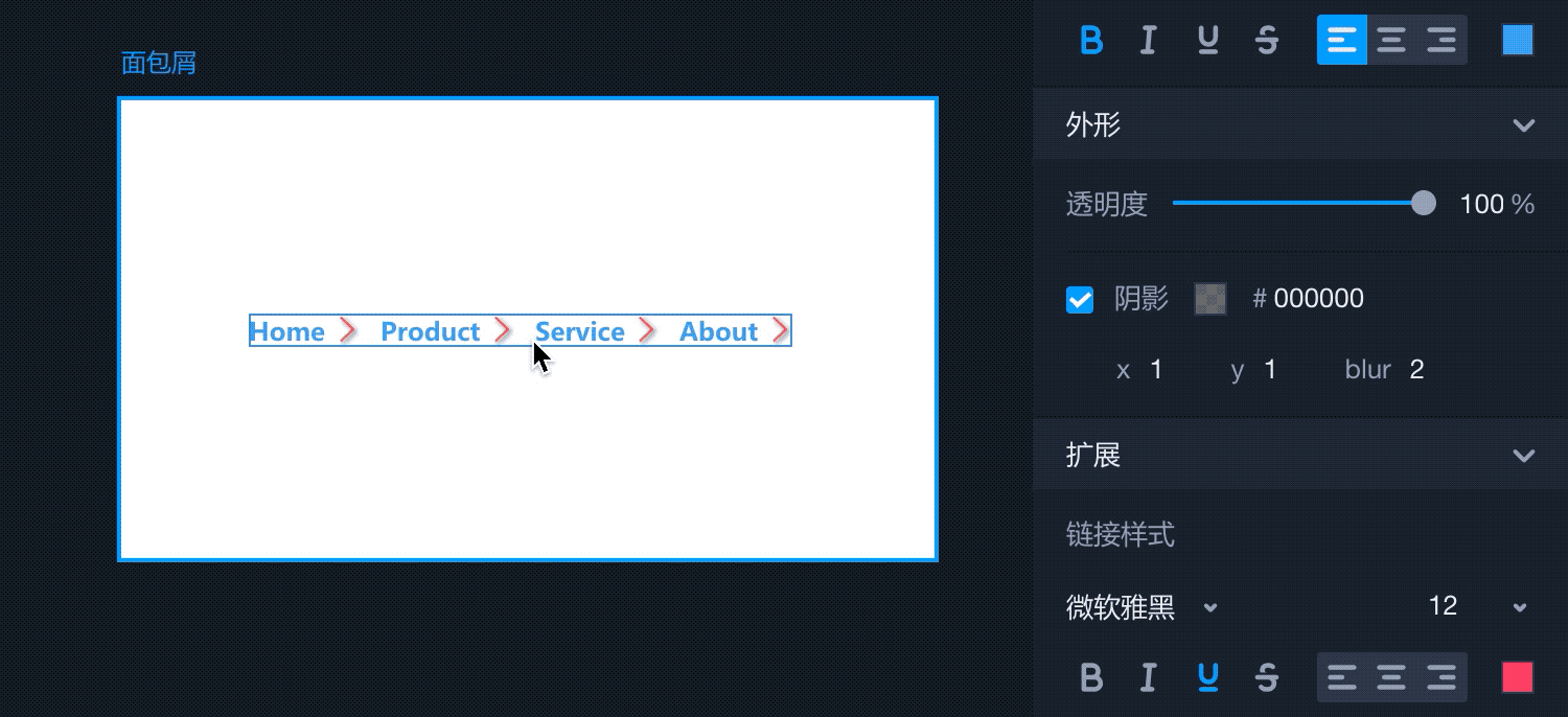- 在右侧属性面板中,可以设置面包屑内全局文字的样式、透明度、阴影等;