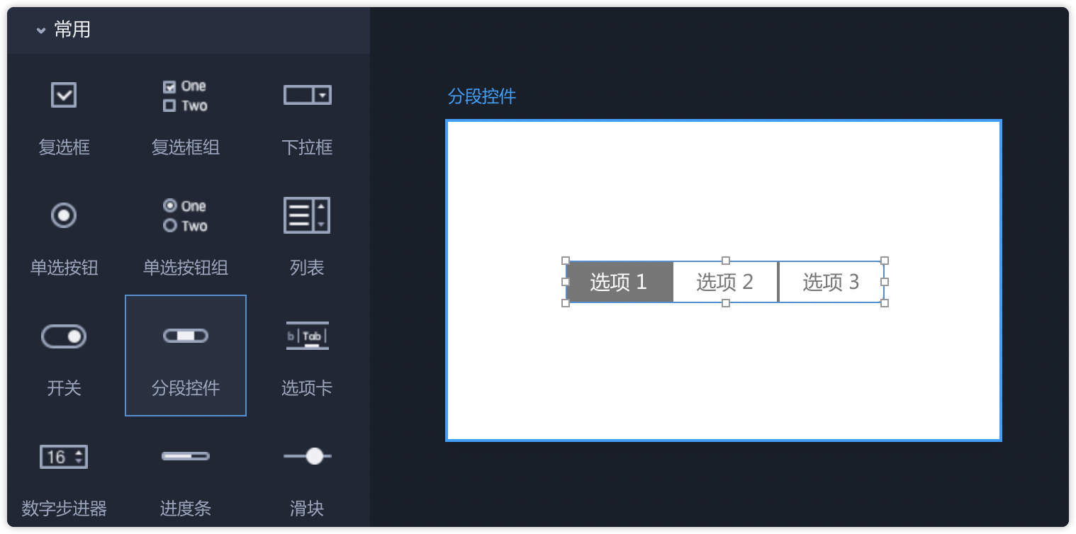 - 从左侧常用组件中拖出“分段控件”,即可直接使用。