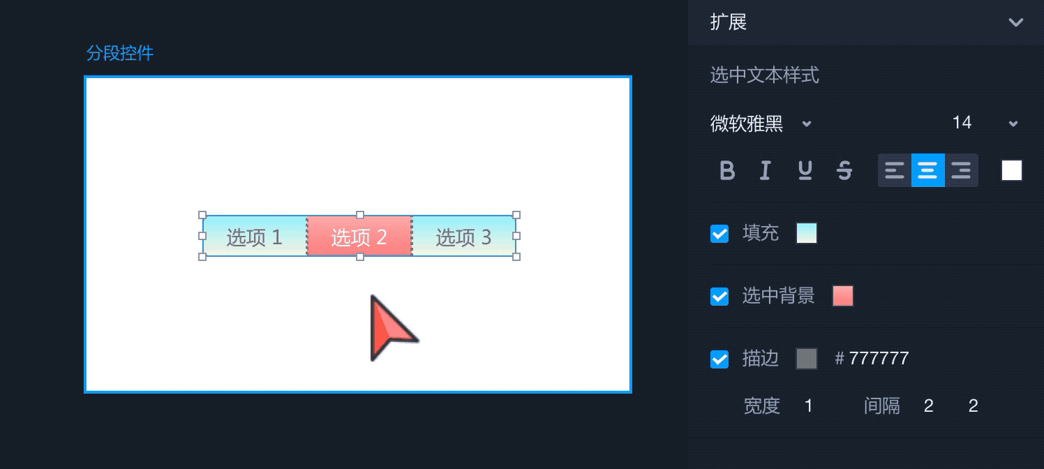 - 在右侧属性面板中,可以设置分段控件全局文本的样式、透明度;