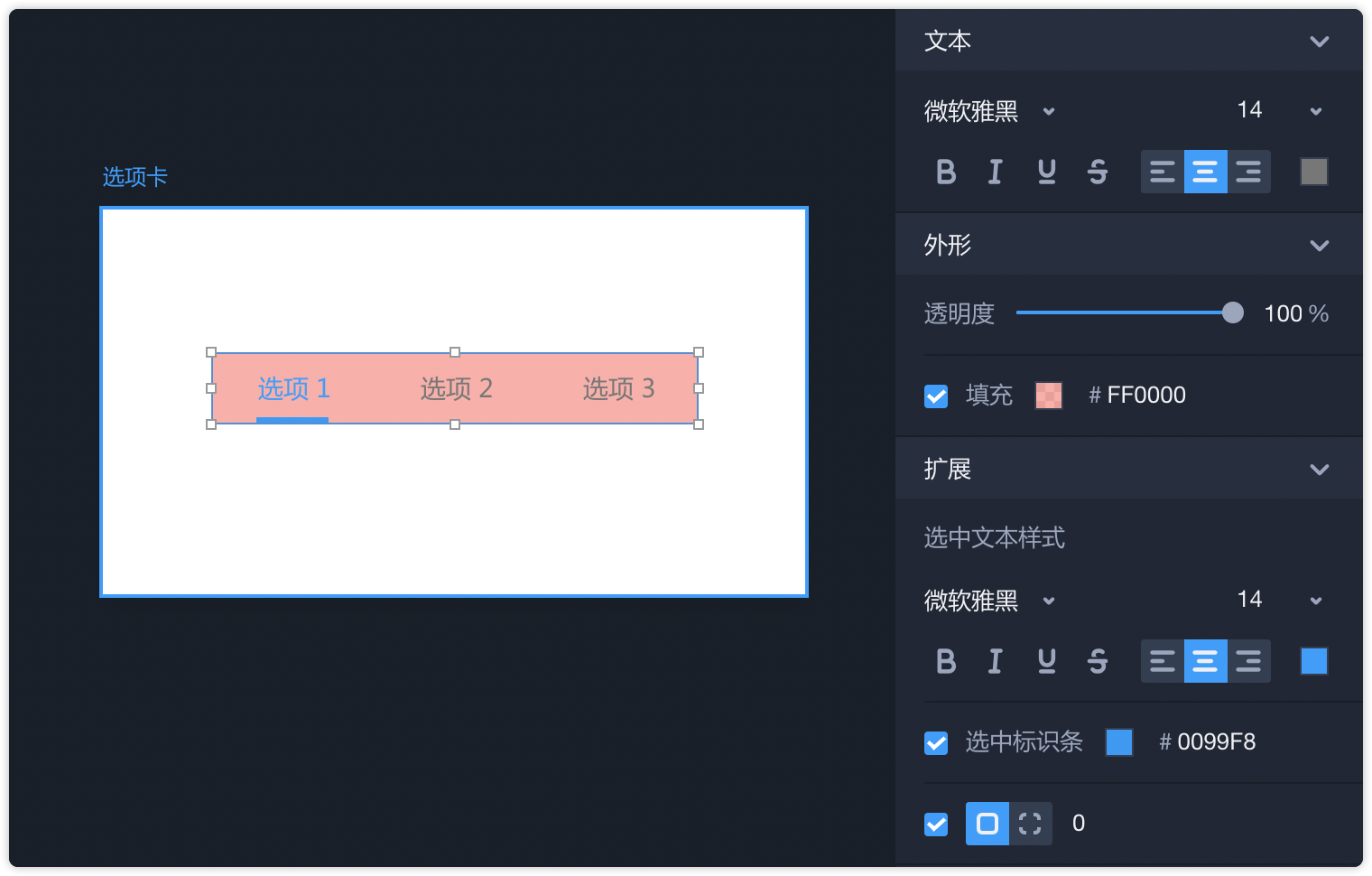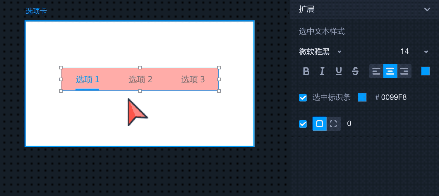 - 在右侧属性面板中,可以设置选项卡全局文本的样式、透明度、填充色;
