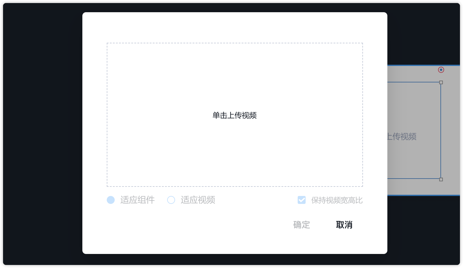 选中视频组件,按Enter键出现的弹窗中,单击上传视频。视频上传完成后,可选择视频尺寸为组件大小或视频本身的大小。还可以勾选是否保持宽高比。