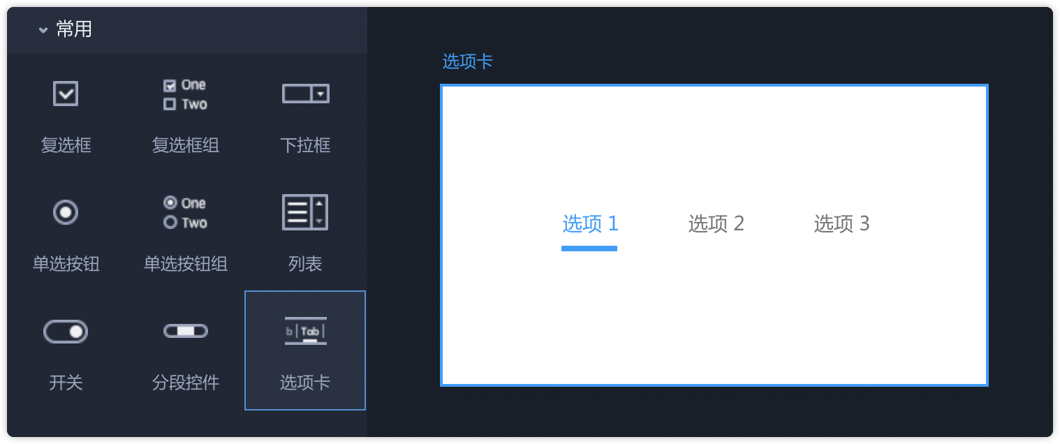 - 从左侧常用组件中拖出“选项卡”,即可直接使用。