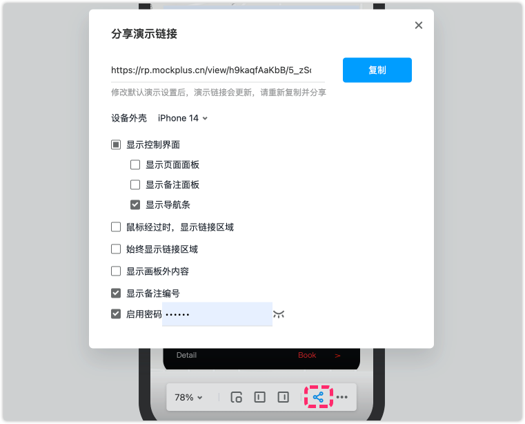 点击“分享演示链接”,可以快速将演示链接复制到你的剪贴板,方便进行粘贴并发送给他人。