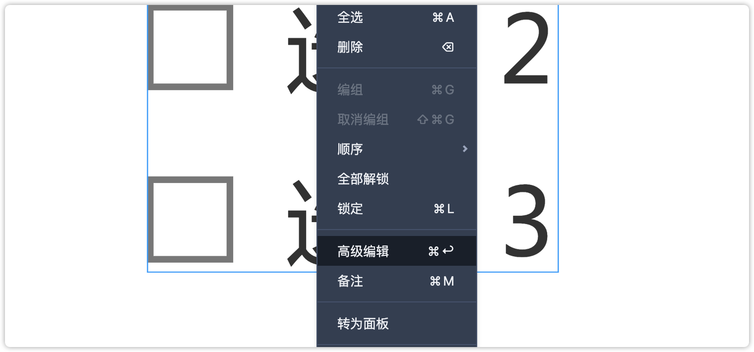 对多项目复合组件使用Ctrl+Enter键,或在其右键菜单中,选择“高级编辑”,即可打开高级编辑器。