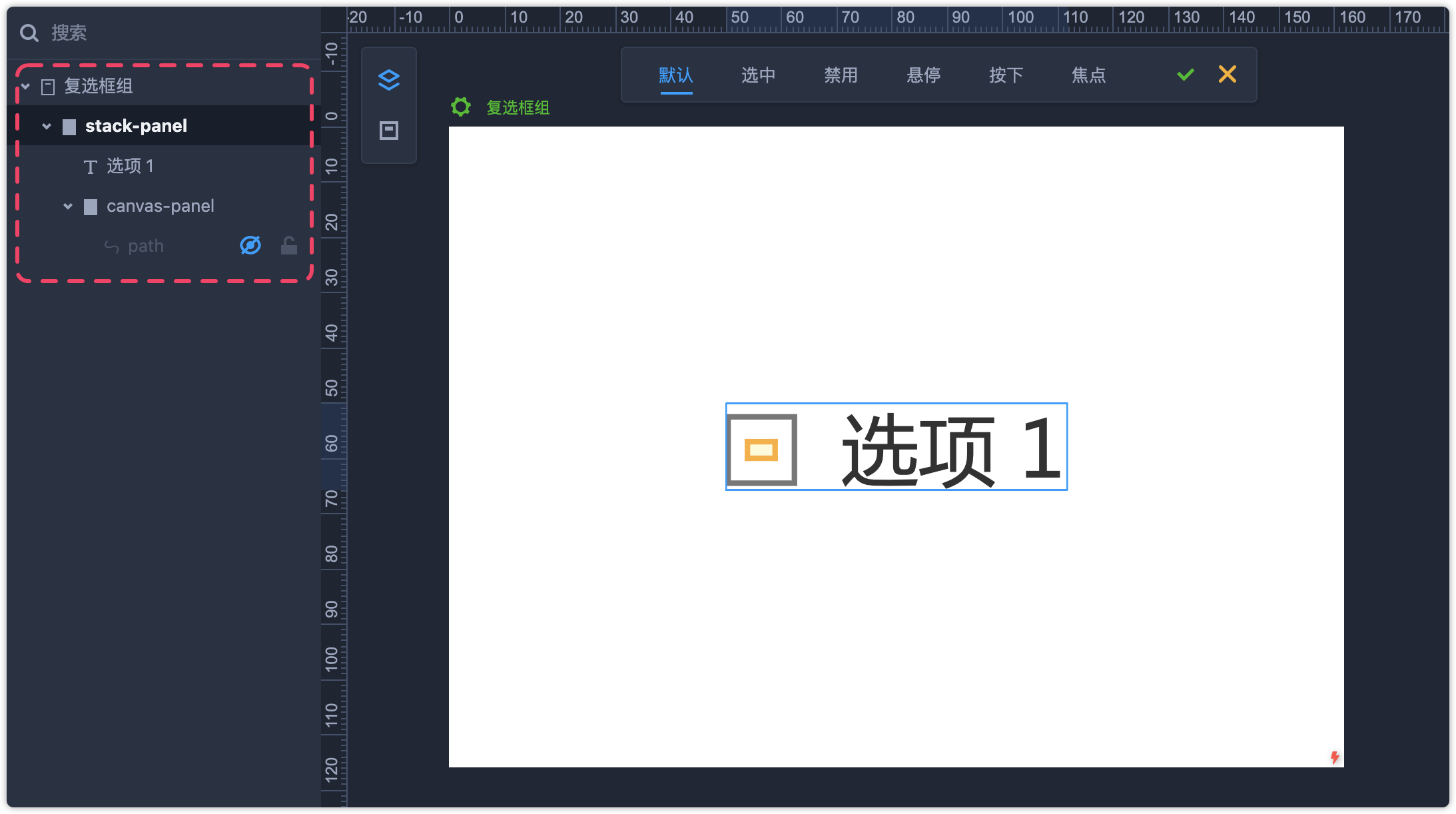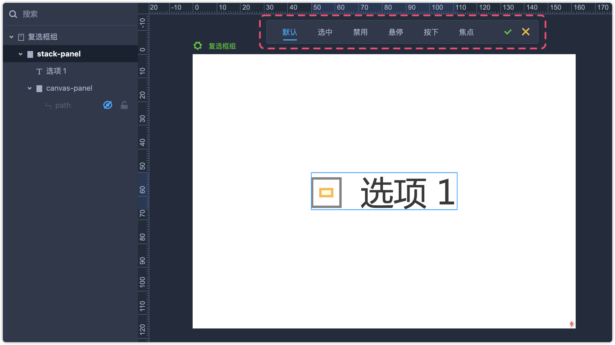 切换状态,可以设置选项在不同状态时的属性样式,如默认、选中、悬停。对元素状态设置的属性,会直接应用到组件中所有该状态的元素上。