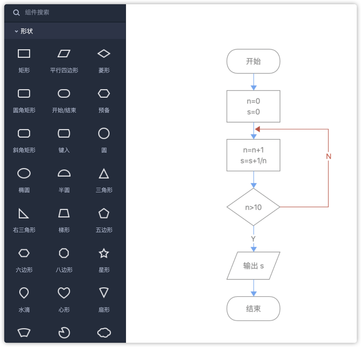 摹客RP的组件库中为你提供了多个常用流程图形状,帮助你更快完成流程图的制作。