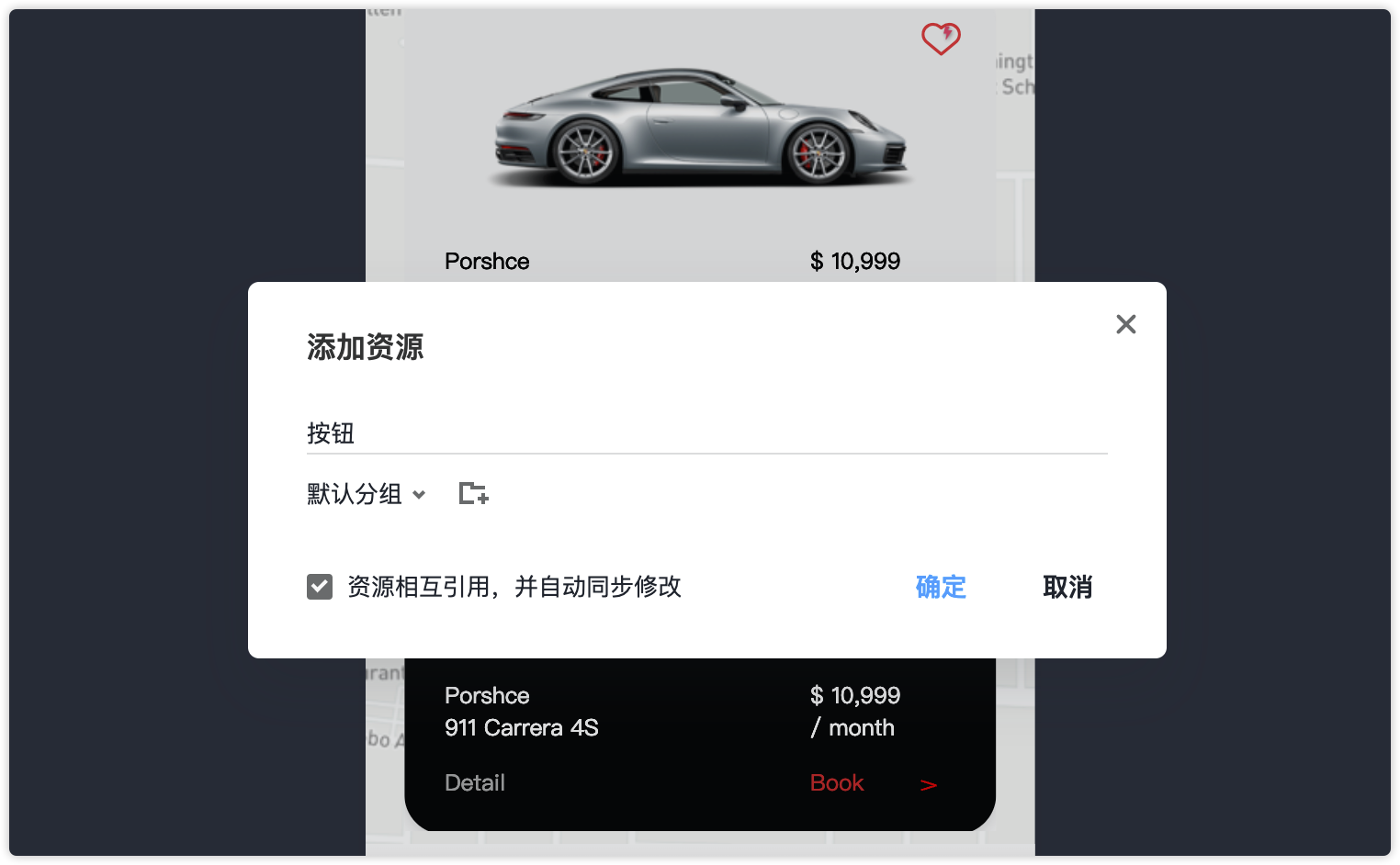 在进行添加时,勾选“资源相互引用,并自动同步修改”,即可将组件存为引用组件资源;反之,则会将组件存为普通组件资源。
