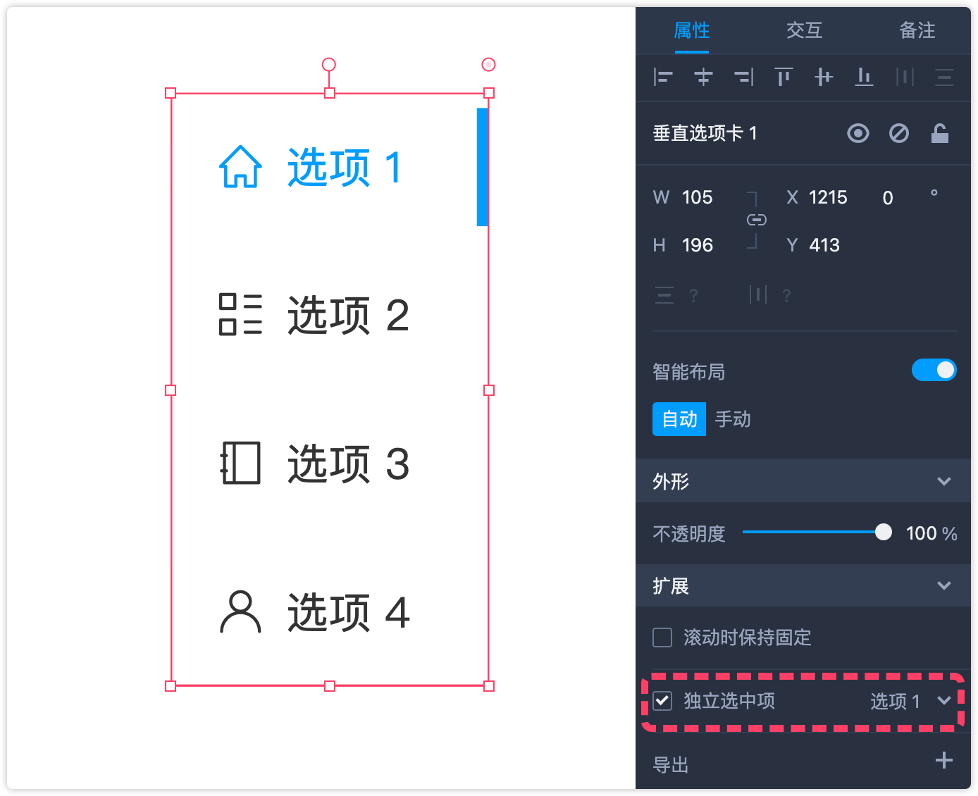 - 选中组件资源的实例,在属性面板的扩展属性中勾选“独立选中项”,并选择具体的选项。