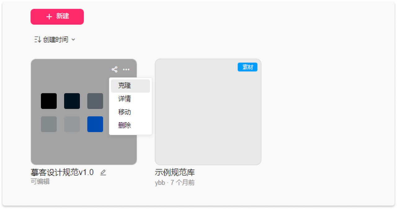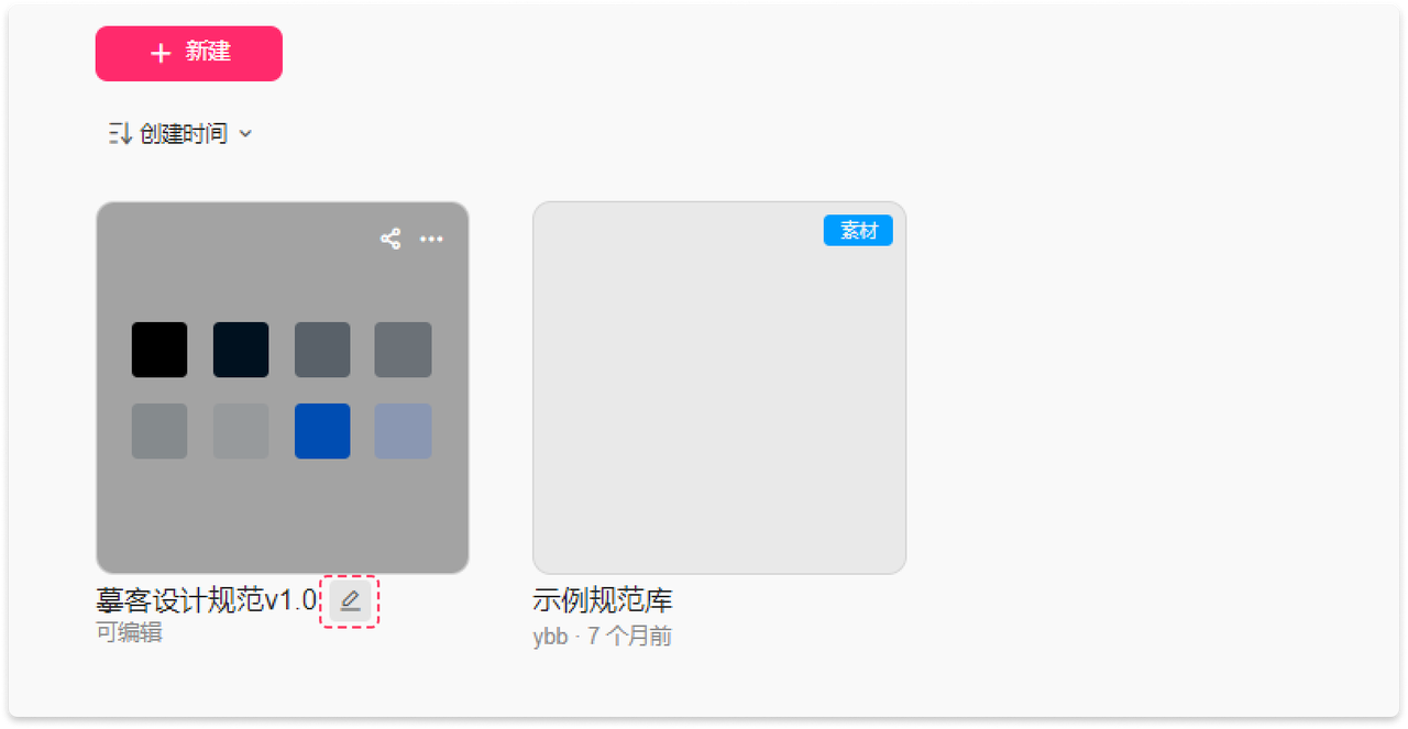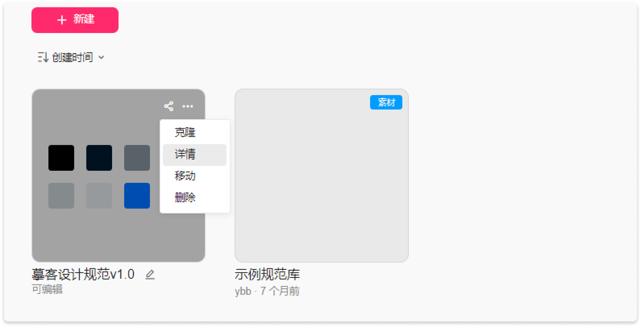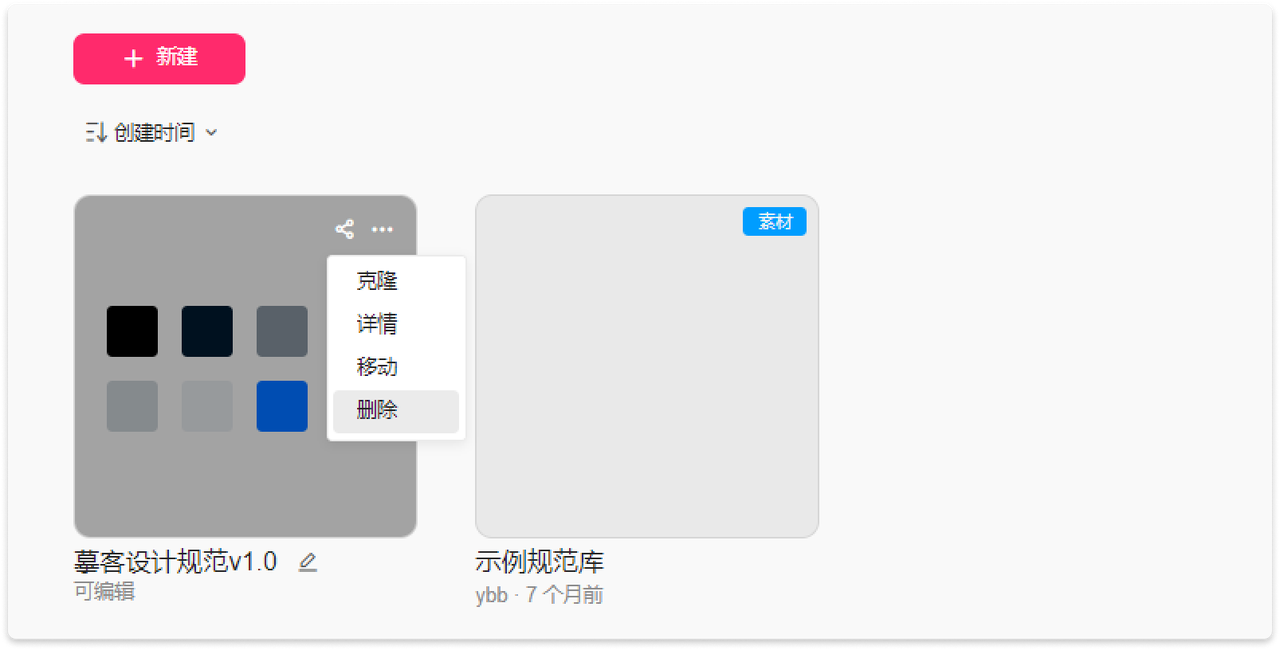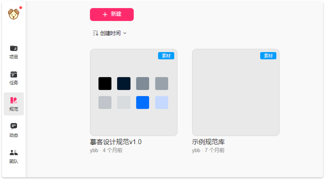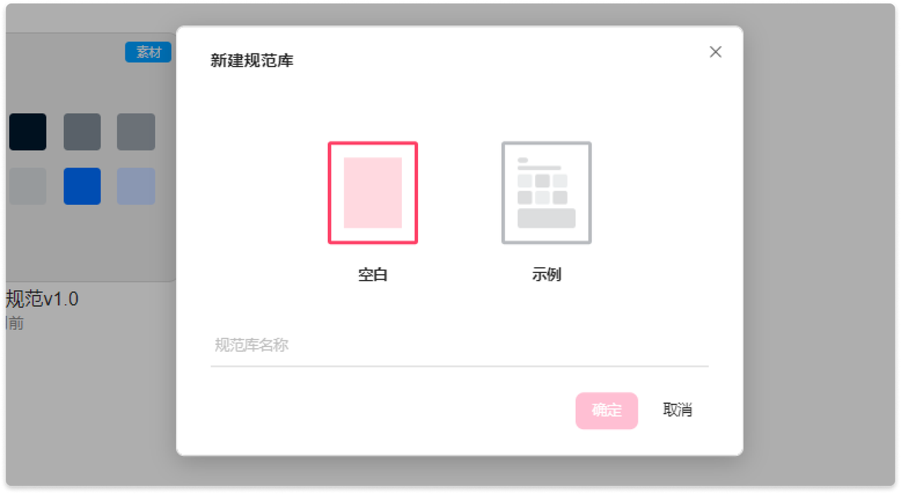 新建“素材项目”,在弹窗中选择“空白”或“示例库”并输入规范库名称,即可成功创建项目。示例库项目是摹客提供的默认例子,其中包含了颜色、文本、图层样式、图标等规范供参考。