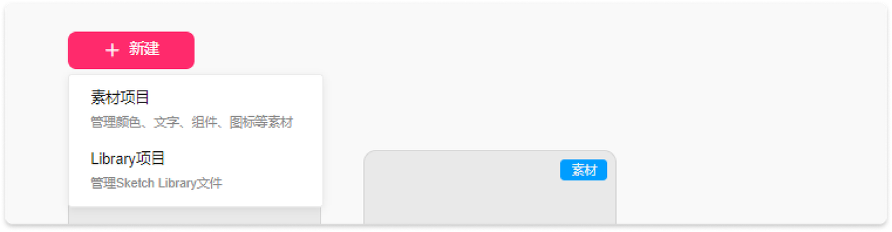 新建时,可以选择“素材项目”或者“Library项目”。“素材项目”用来管理颜色、文字、组件和图标等素材,“Library项目”用来管理 Sketch Library 文件。