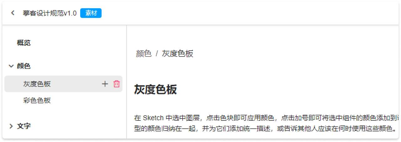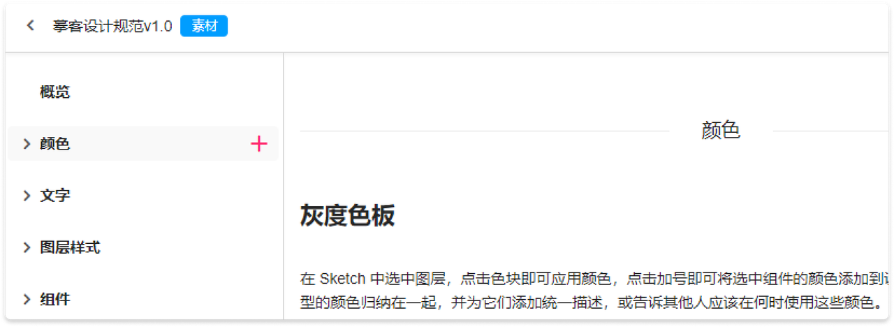 进入摹客设计规范后,在左侧面板可以看到资源分类:颜色、文字、图层样式、组件、图标、图片。鼠标放在任意分类上,便会出现一个加号“+”图标。点击加号“+”即可快速创建一个资源分组。